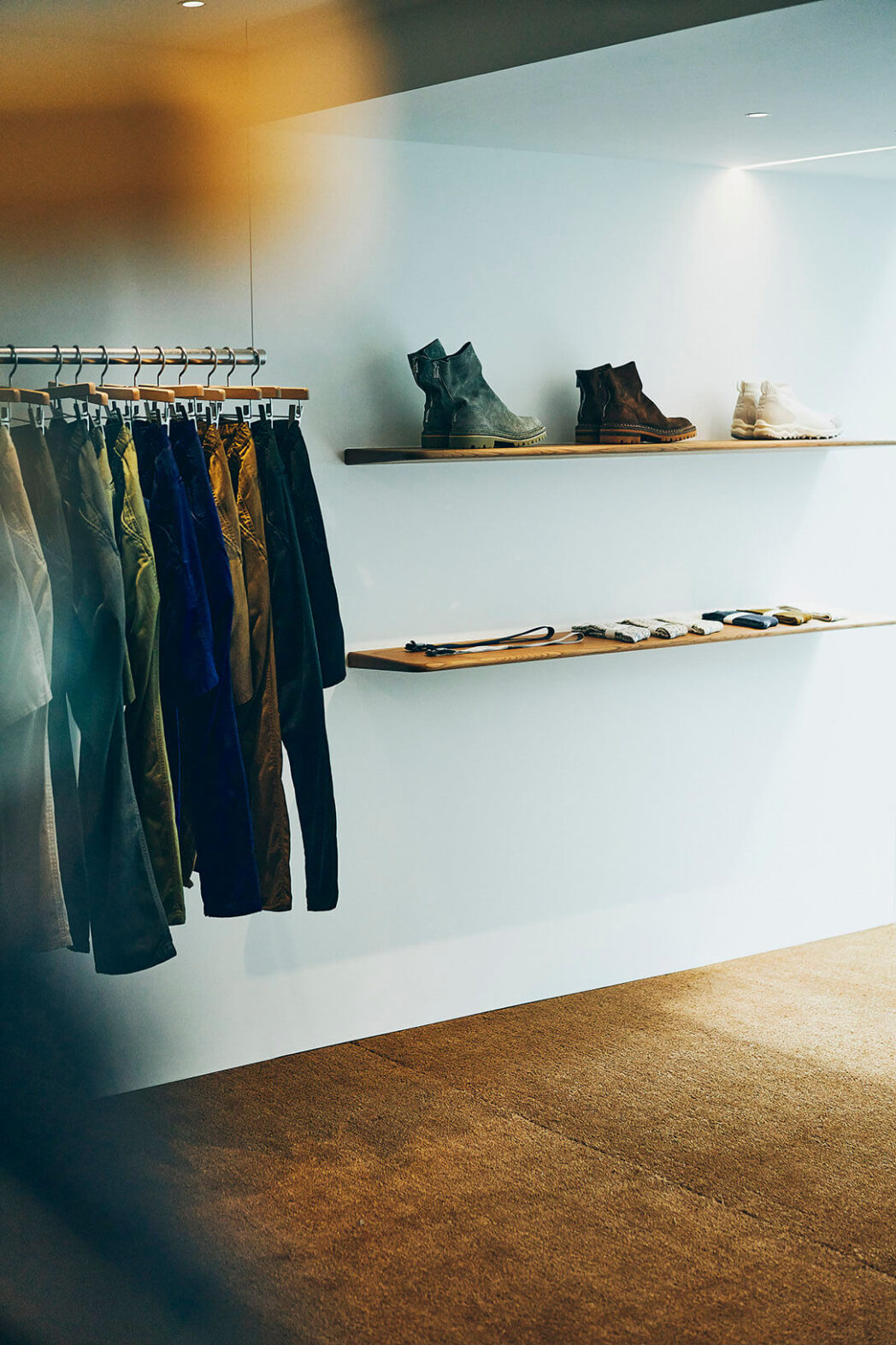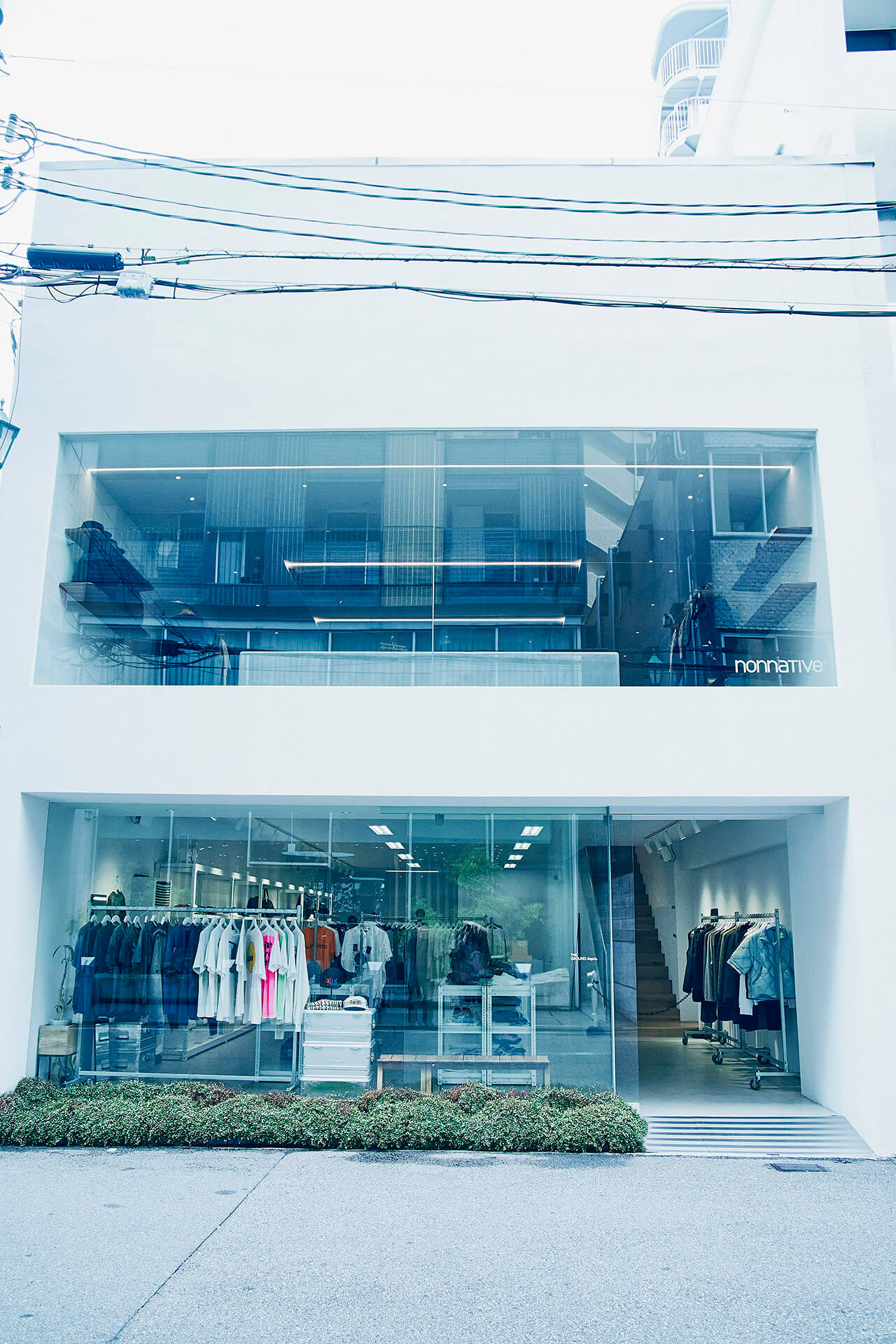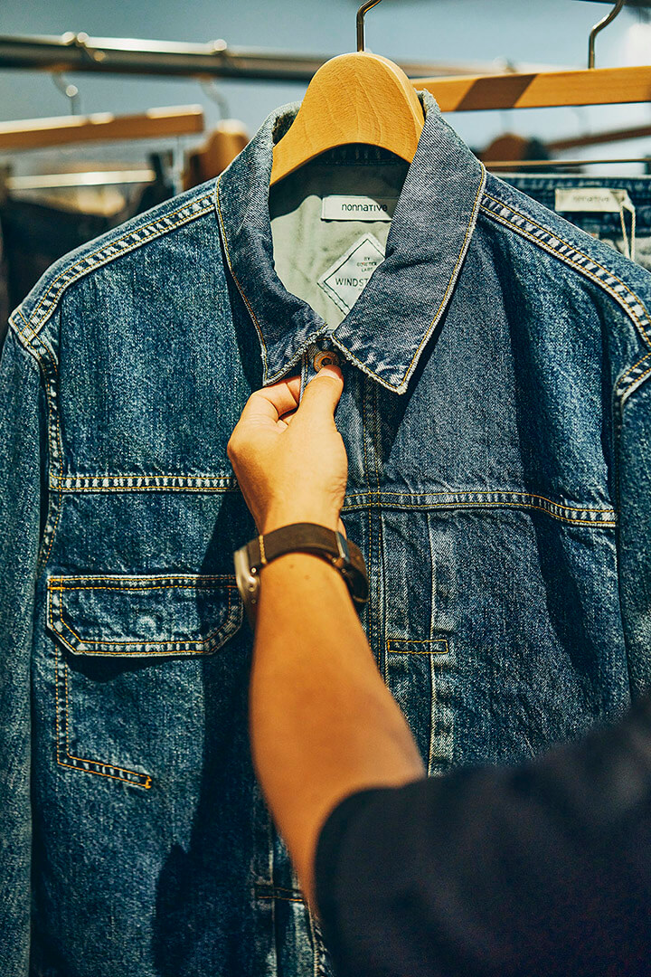 「(飯田)祐士くんにとっても、僕にとっても、すごく良いカタチで大阪店を作ることができたと思います。堀江のメインストリートでnonnativeのショップが出来るなんて、自分自身も想像していなかったことで。フラッグシップがある中目黒は、どちらかというと目がけて足を運んでいただく場所。それとは逆に大阪店は、nonnativeのことを好きでいてくれるひと、名前は知っているけど深くは知らないひとなど、多様な方の目に触れていただけるところです。広さも中目黒とほぼ同じくらいで、ブランドの世界観を存分に表現できるスペース。この大きな窓から、立花通を眺めているだけで、「大阪に帰ってきた」という感情が湧いてきますね」