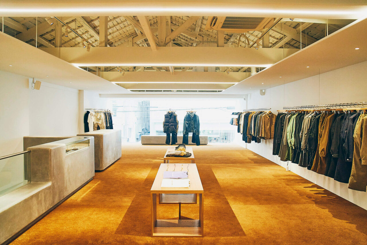 堀江のメインストリート、立花通に位置するセレクトショップ『THE GROUND DEPOT.』の2Fフロア。『the nonnative shop osaka』は、2023年にオープンした東京・中目黒のフラッグシップショップ『the nonnative shop』と同じく、大きな窓から自然光が降り注ぐ、ゆったりとしたスペースに構築。良い意味でクセの強い大阪、そしてミナミの街並みで、nonnnativeの世界観がそのまま表現されている。そんな大阪とは縁深い藤井氏。美術大学への進学のため上京する前は、ミナミエリアに足繁く通ったと言う。